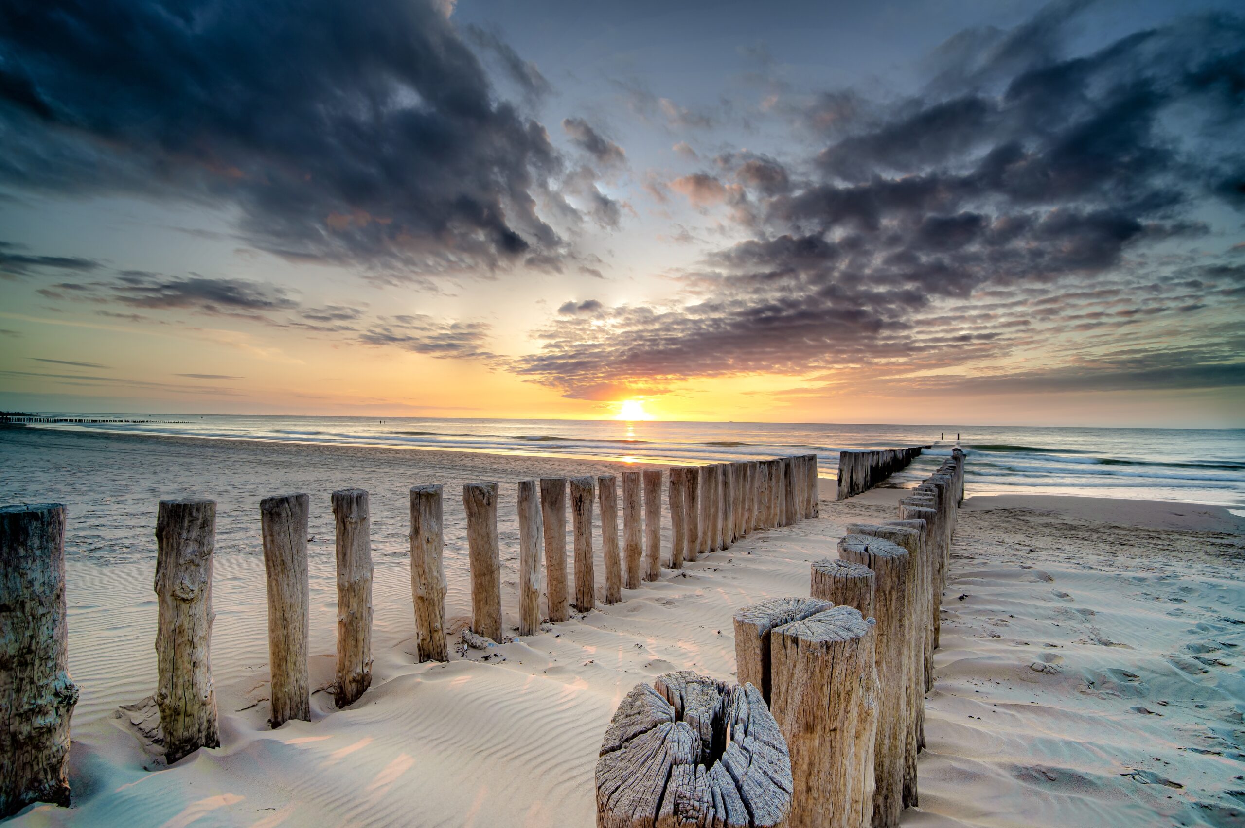 High angle shot of a wooden deck on the shore leading to the sea at sunset